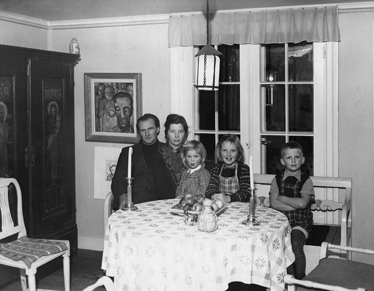 Interiör hos konstnärsparet Campbell och Hesselmark på Bergsgatan 14 i Gränna. Ett bord med mönstrad duk, fat med äpplen samt två ljusstakar. I soffan sitter konstnärerna Classe Campbell och Pia Hesselmark samt barnen Christina, Maria och Johan. Till vänster står ett högt målat skåp med madonna-motiv samt en oljemålning på väggen.
