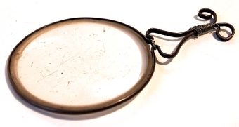 • Lornjett infattad i smal mässingstråd som fortsätter i ett handtag. Handtaget dekorerat med hoptag och öglor.