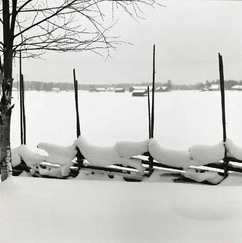 • Utsikt över åkrarna från gården Sunnanåker. Fastbandhage med snögirlanger, februari 1986.