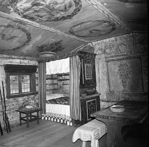 Herrstuga med tak- och väggmålningar. Där finns en bäddad skåpsäng, en pall med knyppeldyna, gevär lutade mot väggen och ett bord med bänk. Delsbo Forngård 3 juni 1978.