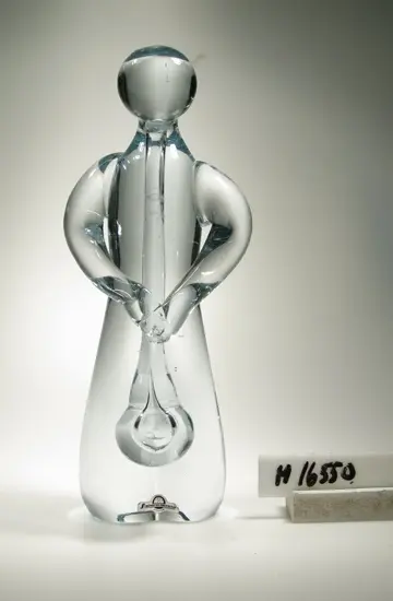 Glasblåsare. Hyttarbetat. Glasmodellen utarbetad av glasblåsarna Hilbert Karlsson och Kjell Andersson, samt konstnären Gunnar Nylund. Frigjord med påklipp och känsla. Klarglas. Lapp: "Strömbergshyttan".