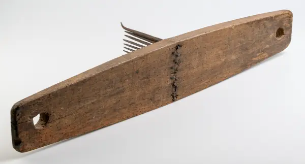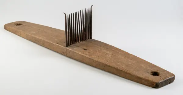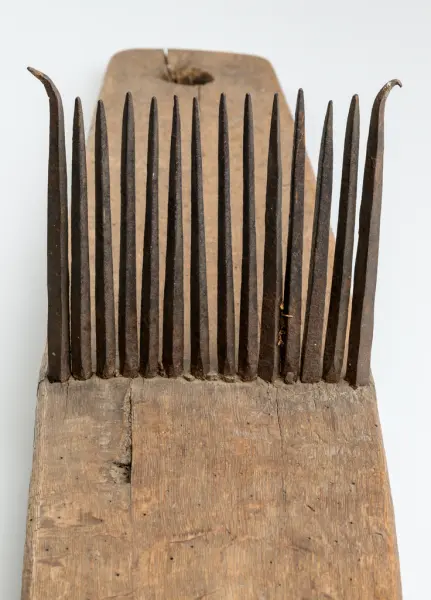 • Linrepa av trä med järnpiggar på rad i mitten, de två yttersta piggarna är något utböjda.