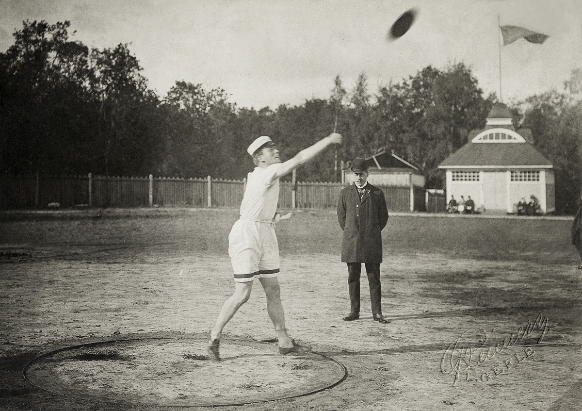 SM i femkamp på Strömvallen i Gävle, 1908. Hugo Wieslander kastar diskus och vinner.