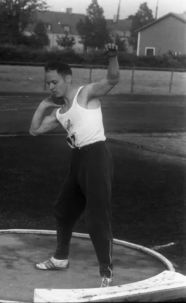 Ung idrottsman iklädd vitt gymnastiklinne, mörka gymnastikbyxor samt vita gymnastikskor utövar sporten kulstötning. Han håller kulan med högra handen i halshöjd.