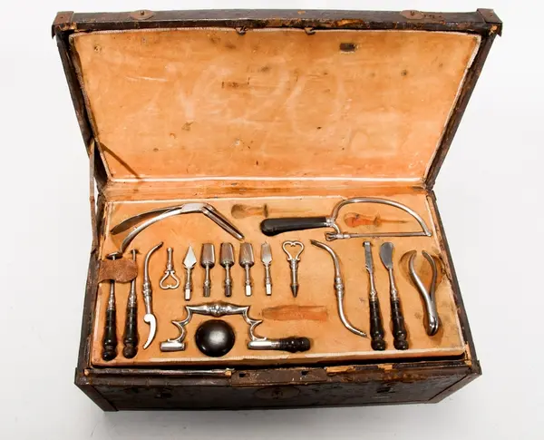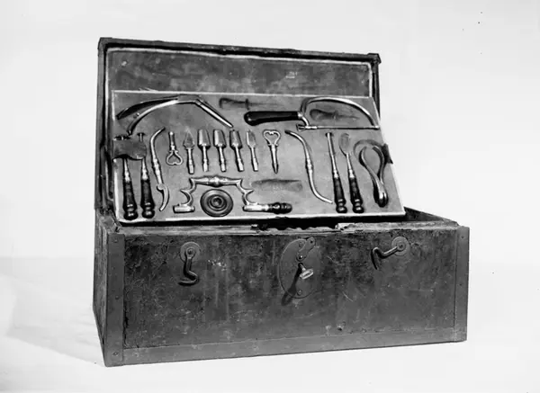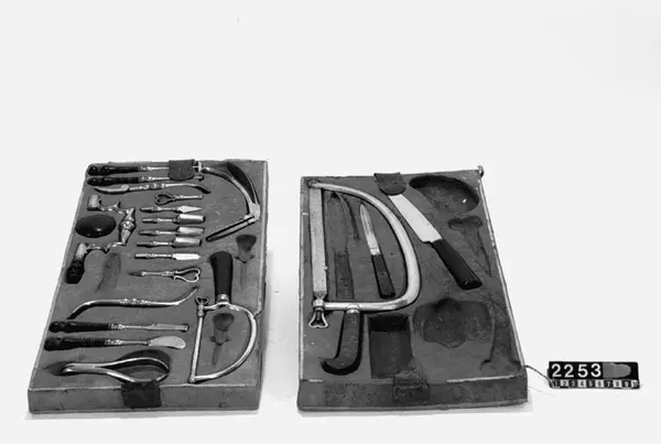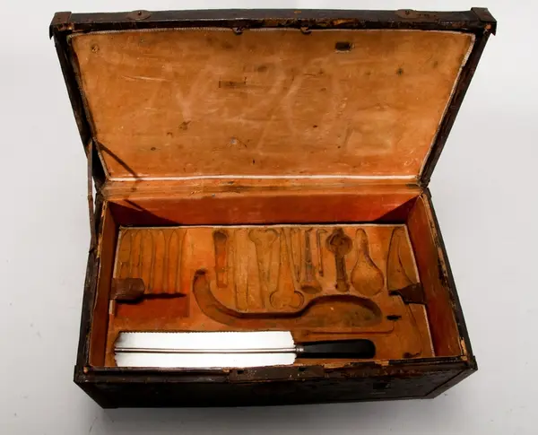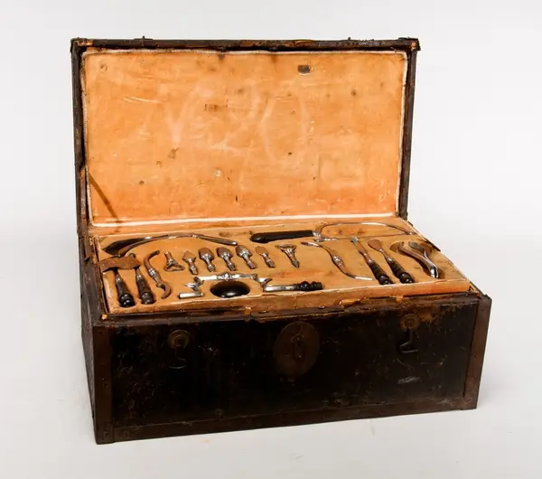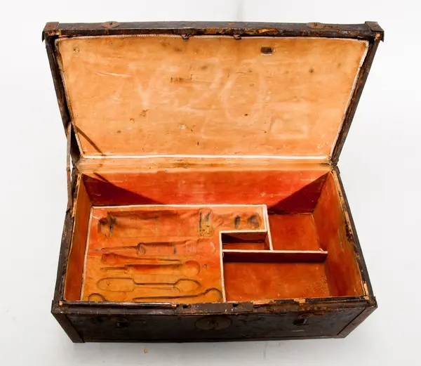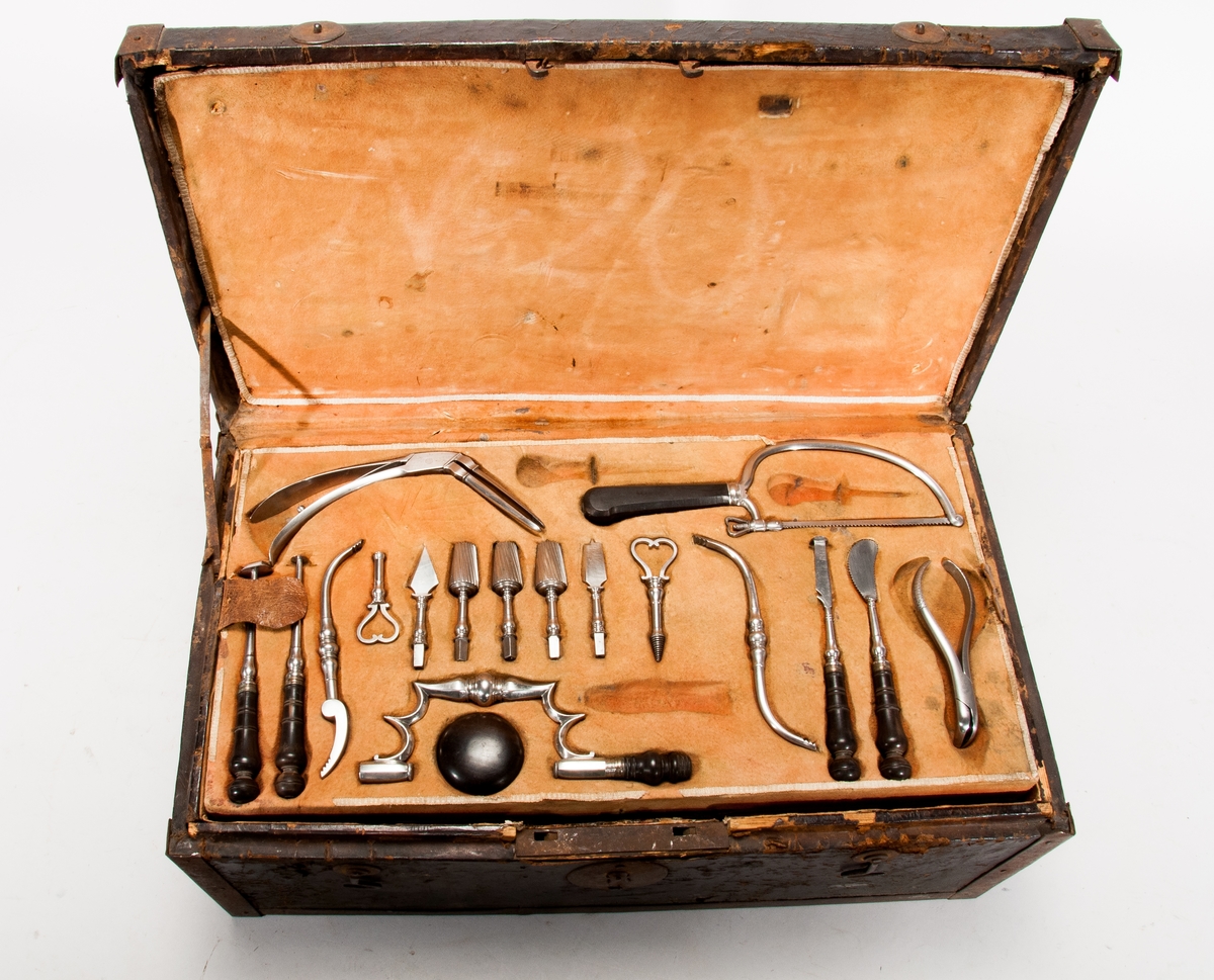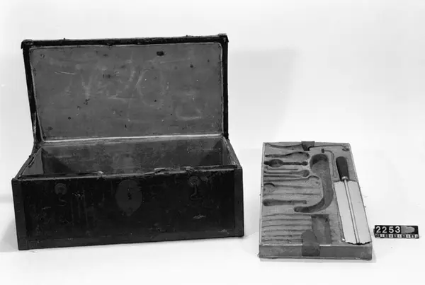 • En läderklädd, järnskod trälåda innehållande läkarutrustning. Tre sämskinsklädda brickor med instrument.