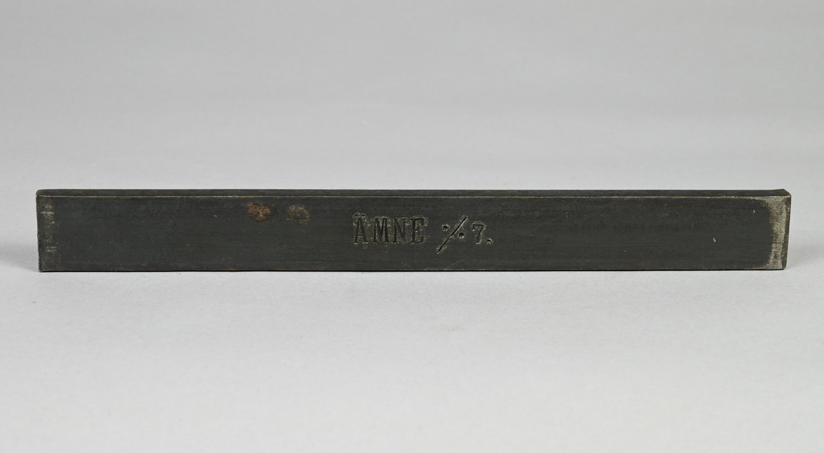 • Ämne till hästsko, del av tillverkningsserie av Haksko nr. 7. Tillverkade av Broby Mek. Verkstads AB.. Märkning på provet med notering: "Ämne % 7."