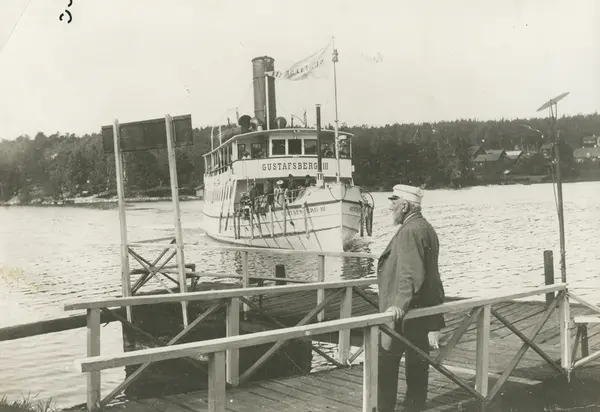 Fabriksrederiets ångbåt Gustavsberg III. Fisksätra Holmes brygga, i bakgrunden syns Lännersta.<br><br><br><br><br>