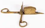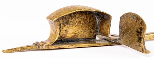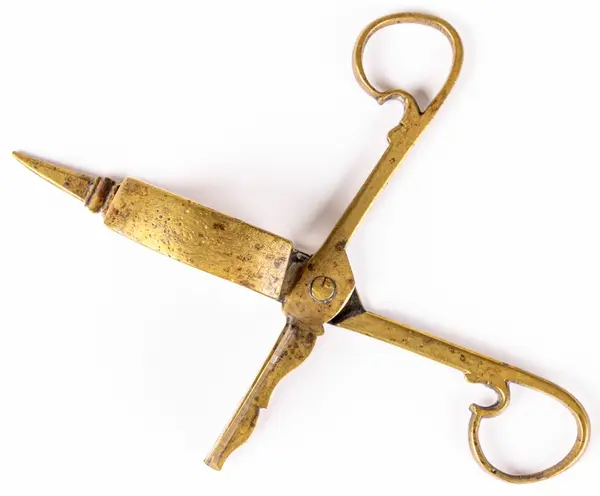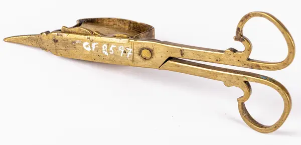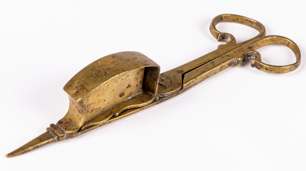 • Ljussax av mässing, med vekhus. Detta har upptill svängd kontur. Utan fötter.