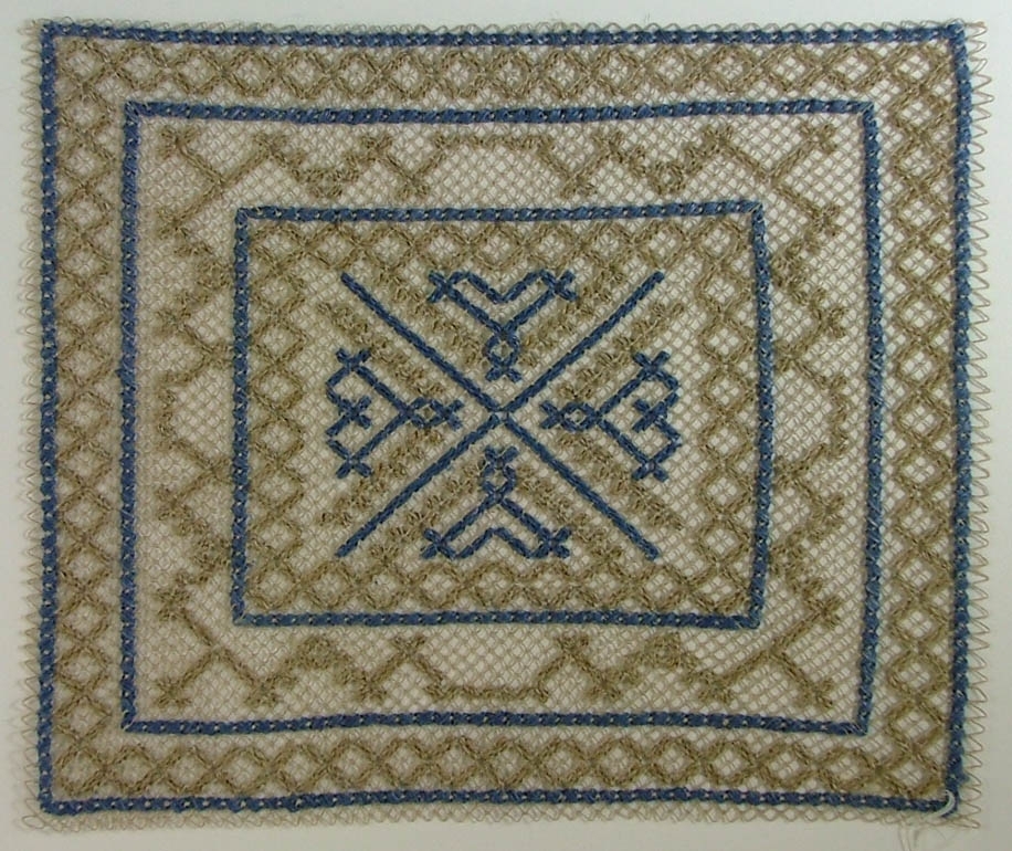 • Pinnspets i lingarn. Knutet nät av oblekt, 2 tr lingarn. Mönstret trätt med 4 trådar enkelt, oblekt lingarn samt 3 trådar enkelt, blått lingarn. 4 st hjärtan runt mittpunkten samt bårder med zickzackmönster. Vidhängande pappersetikett.