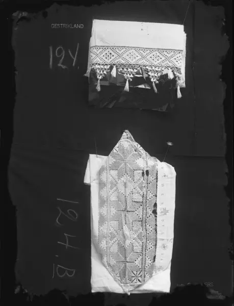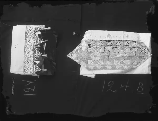 Handkläde/hänglakan med kläppfrans. (124) Örngottshuva i pinnspets/knutet och trätt. (124 B)