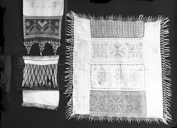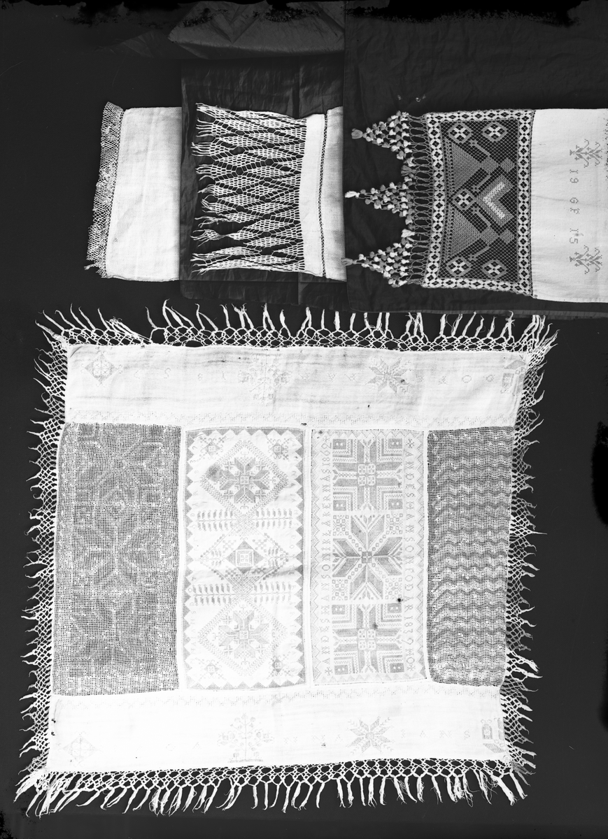 Handkläde med bård i knutet och trätt (pinnspets) och kläppfrans märkt "19 GF 15". Handkläde med bård i flätning. Handkläde med bård i knytning. Duk hopsydd av 4 örngottshuvor och bård av hänglakan, knuten frans runt om. En märkt "AANDES HANSON FÖD ÅR 1839 HO" "ANDES HANSON I KLÅKERNÄS 1862".