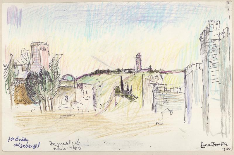 • Vy vid Oljeberget. Teckning av Einar Forseth, påsk 1960. Färgpenna, tusch.