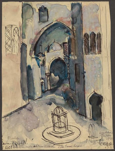 • Skiss efter önskan? av Prins Wilhelm efter Tunis besök. Scendekorförslag Hassan av Flecher. Teckning av Einar Forseth, 1922. Akvarell och tusch.