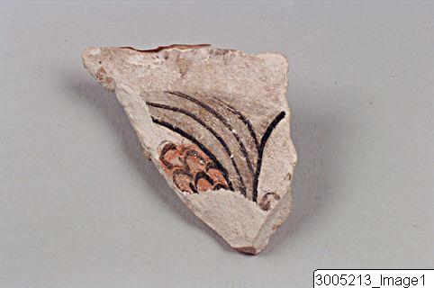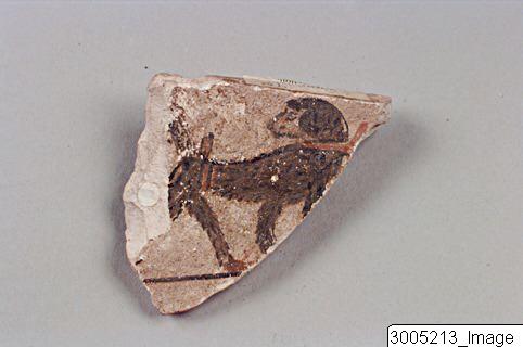 Ostracon, irregularly shaped. Sketches on both sides in red and black. On one side, there is a monkey, walking on all four legs towards the right, while turning its head towards the left. It is outlined in black, the fur is coloured black, with darker strokes to highlight it. The face and feet are coloured red, as is the collar around its neck. The monkey is walking on a black baseline. The reverse has a fragmentary sketch of a dum-palm tree, with parts of the leafs and fruits visible, outlined in black, coloured grey and red. Limestone.