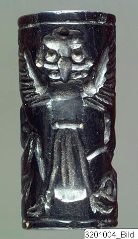 Pierced lengthwise. Incised decoration consisting of a winged Janus-faced figure dressed in long gown and surrounded by a goat on her left side and a winged quadruped on her right side; the latter is turned upside down; conventionalized palm tree growing up from the forehead of a bucranium, to the right of the goat. Dark grey, shiny haematite.