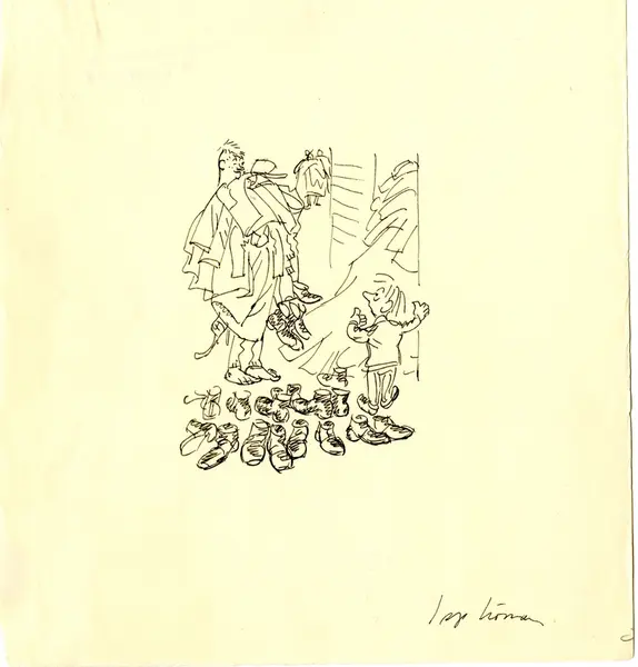 Grupp M I.Tuschteckning av Björn Berg, "Om värnpliktens avkortning". Införd i Dagens Nyheter 4.7 1960.