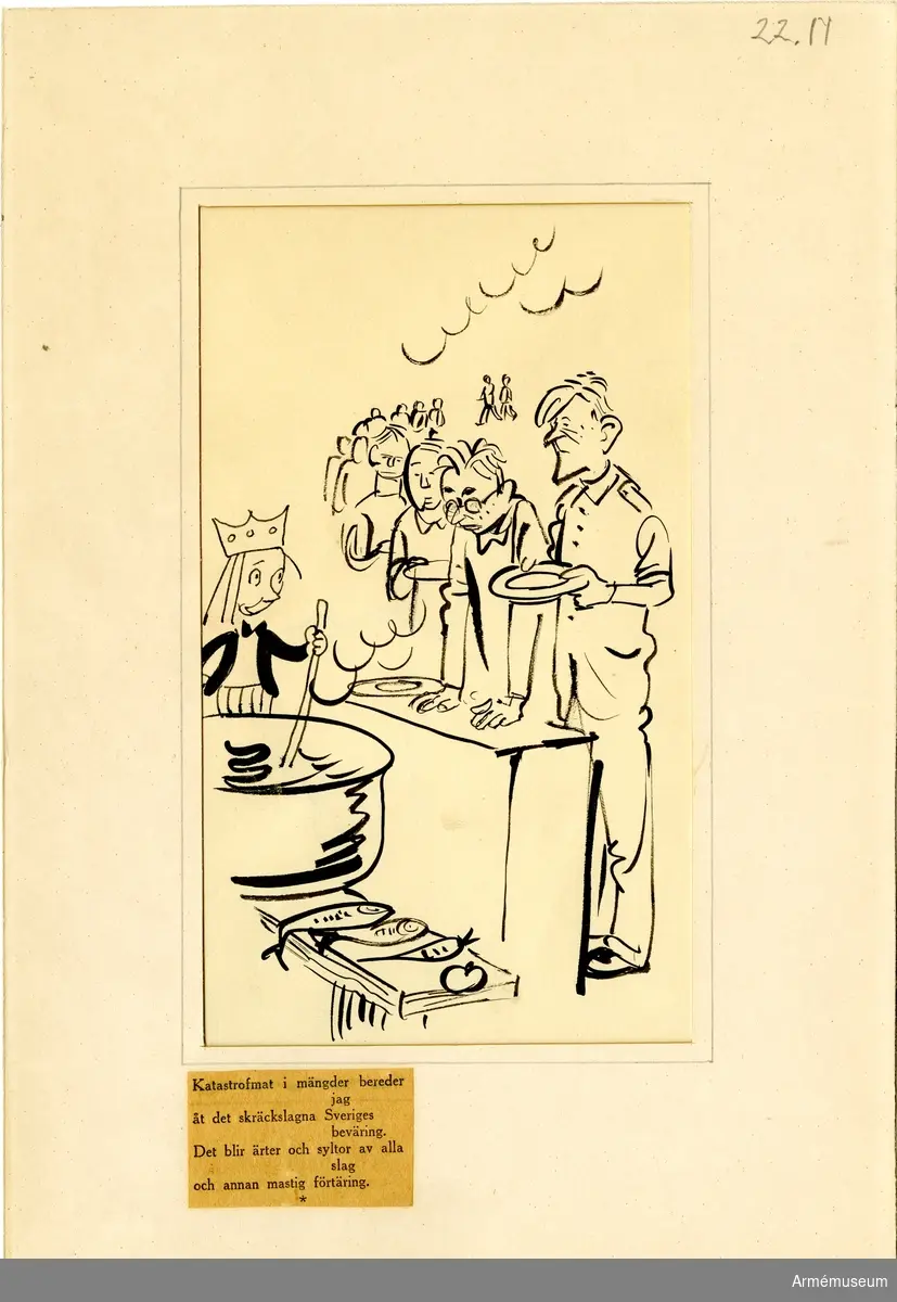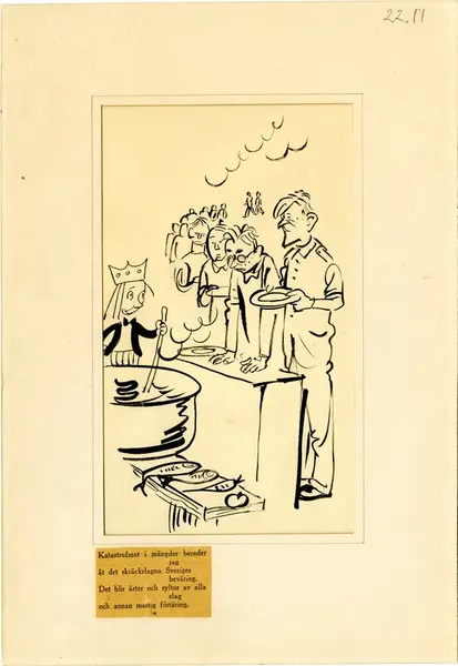 Grupp M I.Tuschteckning av Björn Berg, "Om katastrofmat". Införd i Dagens Nyheter 9.5 1953.