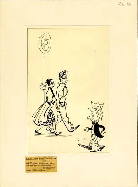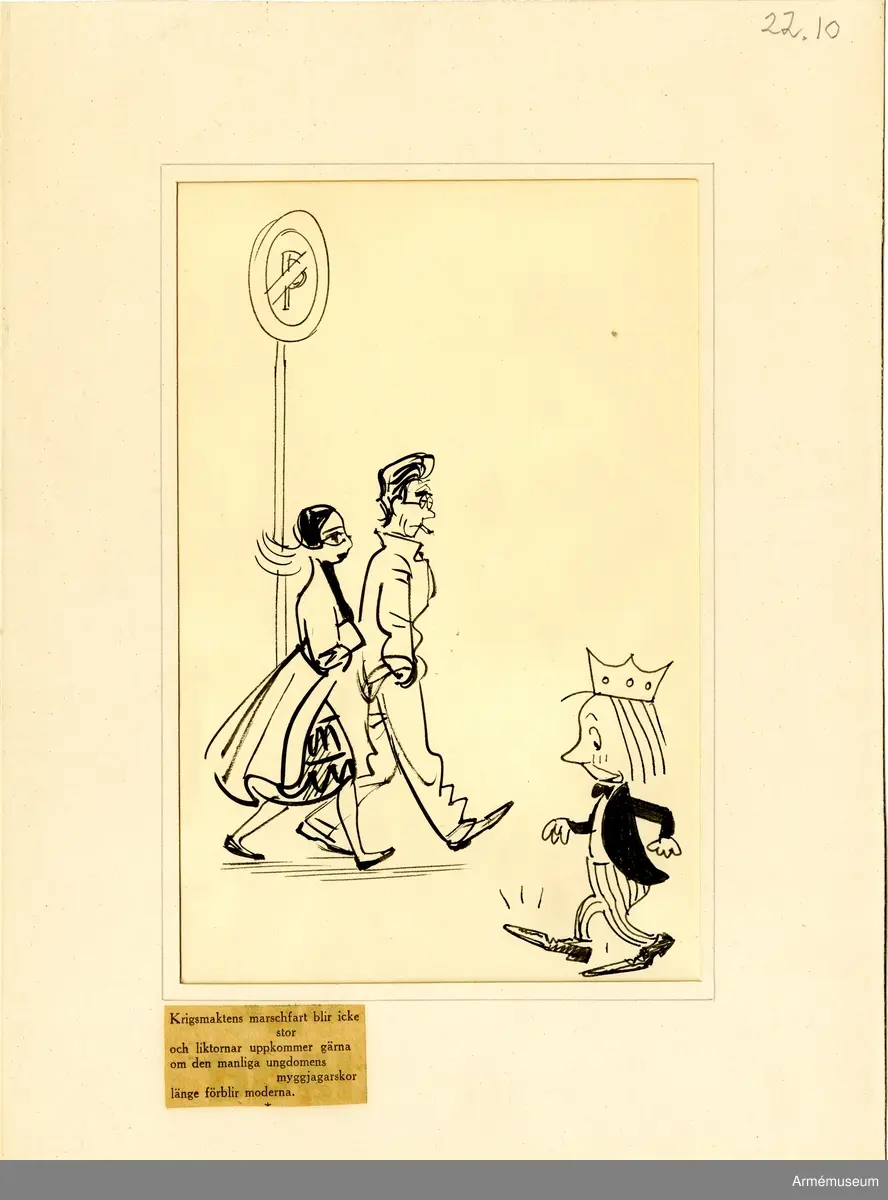 Grupp M I.Tuschteckning av Björn Berg, "Om myggjagarskor". Införd i Dagens Nyheter 23.4 1953.