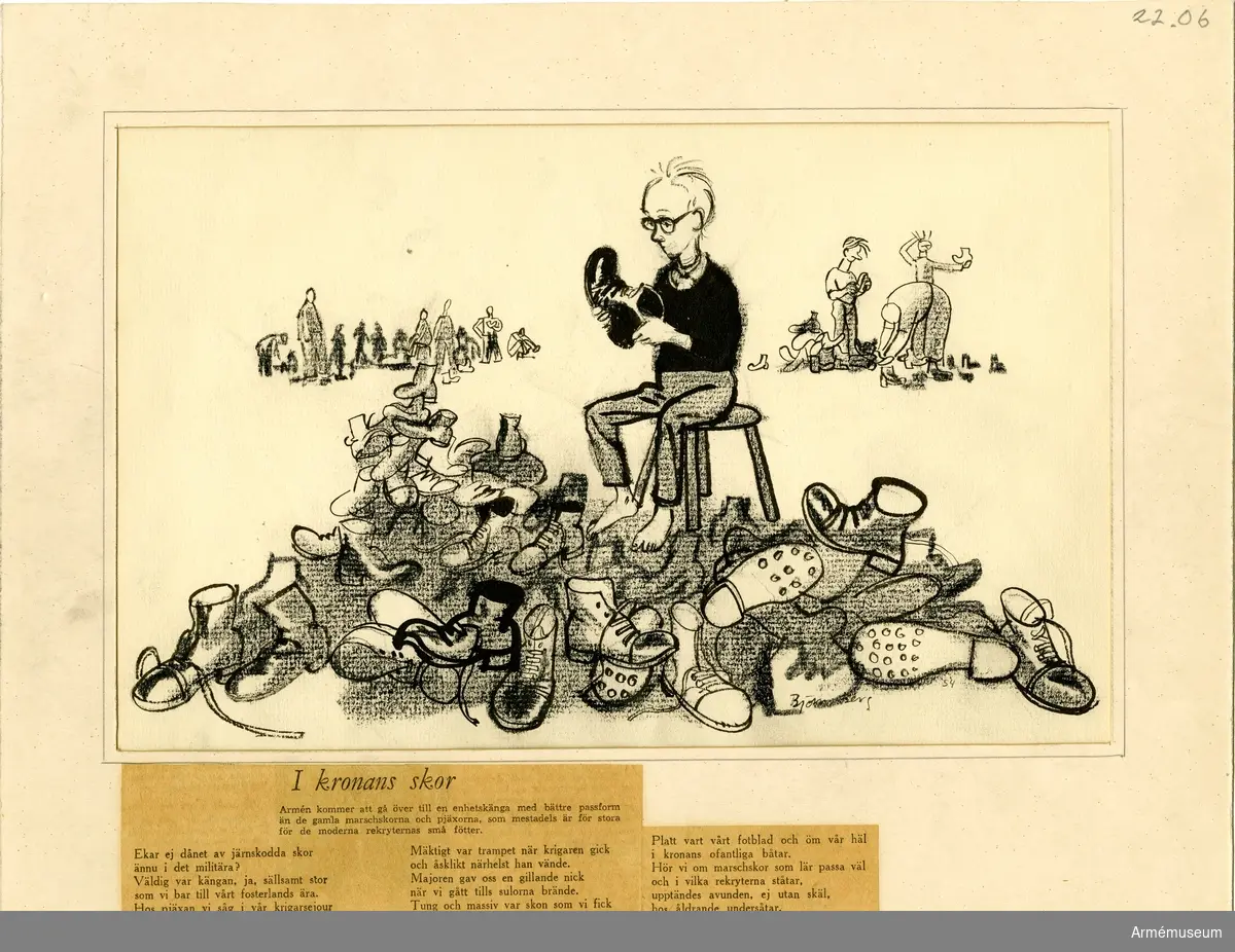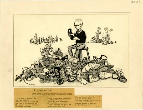 Grupp M I.Tuschteckning av Björn Berg, "I kronans nya skor". Införd i Dagens Nyheter 6.1 1957.