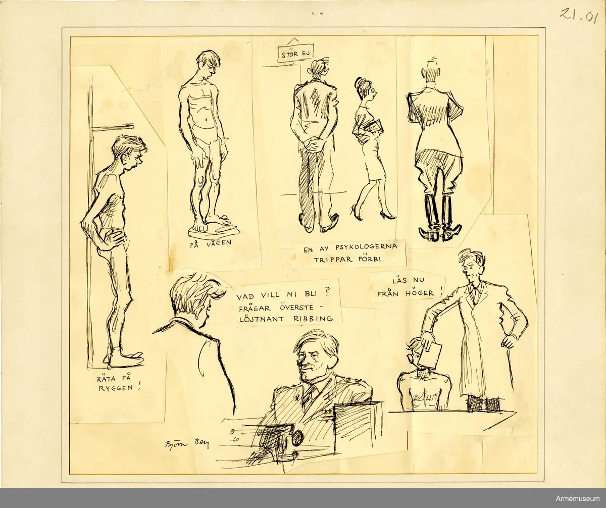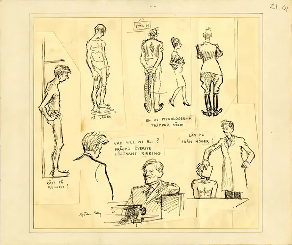 Grupp M I.Tuschteckning av Björn Berg. "Om mönstring". Införd i Dagens Nyheter 12.10 1960.