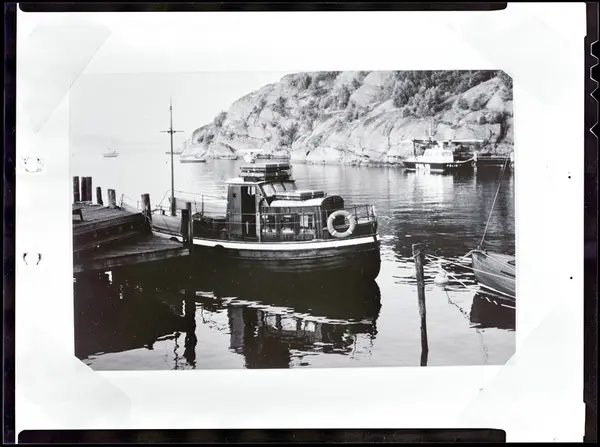 Norum, Stora Askerön, Fiskevik, "Björn". Enl. tidigare noteringar: "Passagerar- och taxibåten "Björn" i Fiskevik, Stora Askerön, i bakgrunden polisbåt. Repro 1985 av foto tillhörande Henry o Olof Asker, Stora Askerön".