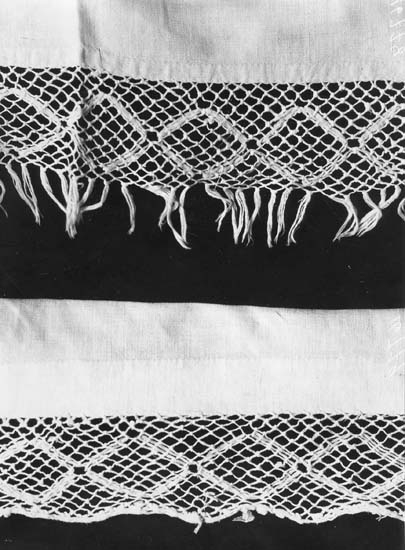 Troligen dukar med trädd pinnspets. Den ena duken är försedd med frans. Kan även användas som hänglakan på bädden (typ överkast)