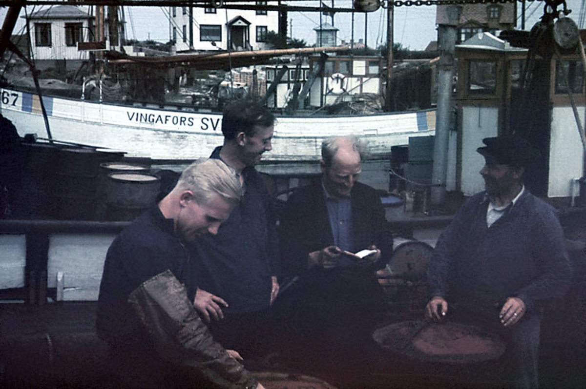 Fyra män står och diskuterar på en båt som ligger i en hamn. I bakgrunden syns ytterligare en fiskebåt. På relingen står GG 367 "Vingafors SVERIGE" samt svenska flaggan . Flaggan var ditmålad en säker...