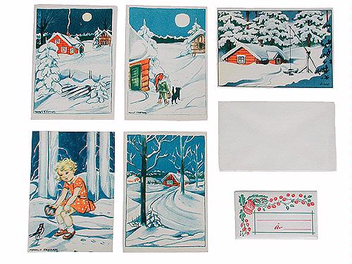 Nyårskort. 19 små (H 7,0 cm, B 10,0 cm) vykort med fem olika vintermotiv. Motiven består huvudsakligen av en knuttimrad röd stuga omgiven av höga snödrivor och snötyngda träd mot en blå bakrund. Motiven är omväxlande signerade MARGIT EKSTAM, Freed eller osignerade.