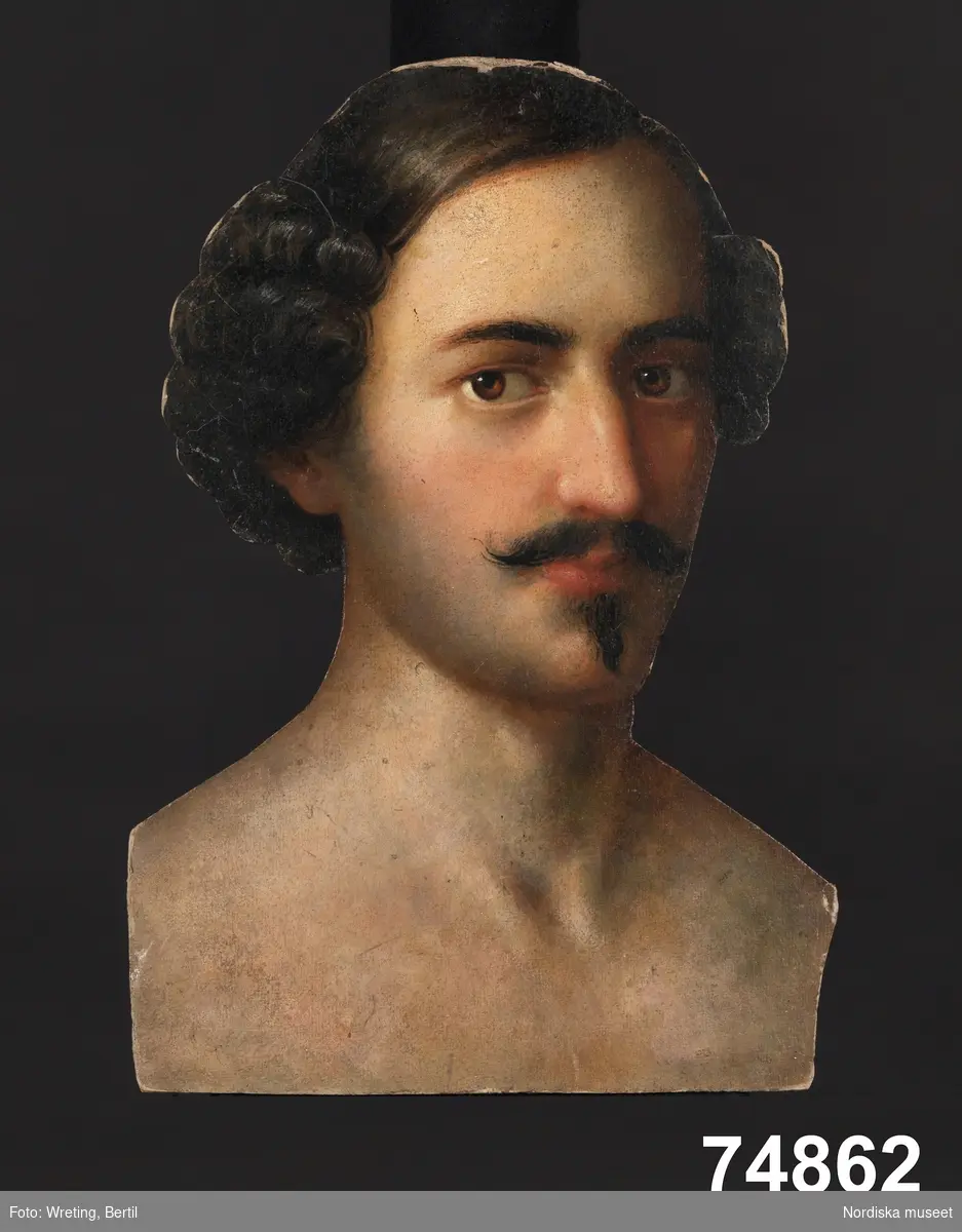 Huvudliggare: " Själfporträtt af C. P. Lehman. I olja. Af honom begagnadt som skylt." Katalogkort: "Tavla, porträtt (C.P. Lehmann). Oljemålning klistrad på en träskiva (konturklipp), 1800-t. f. h. H 37 cm B 26 cm dagermått. Ram: ingen. En bröstbild av C.P. Lehmann, med mustasch och lockig frisyr, med konturklipp. Text på baksidan 'C.P. Lehman'."