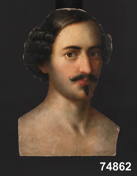 Huvudliggare: " Själfporträtt af C. P. Lehman. I olja. Af honom begagnadt som skylt." Katalogkort: "Tavla, porträtt (C.P. Lehmann). Oljemålning klistrad på en träskiva (konturklipp), 1800-t. f. h. H ...