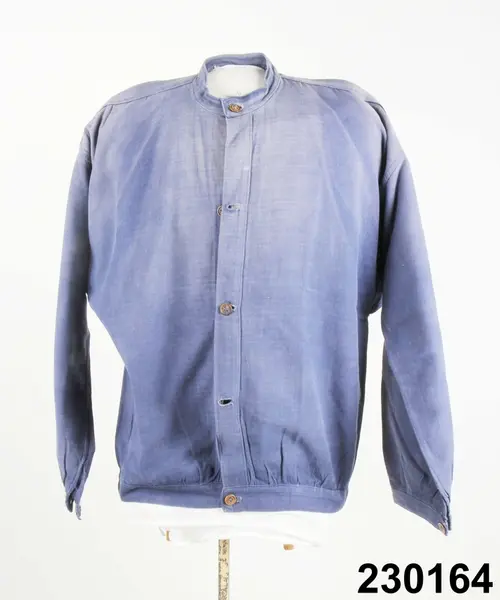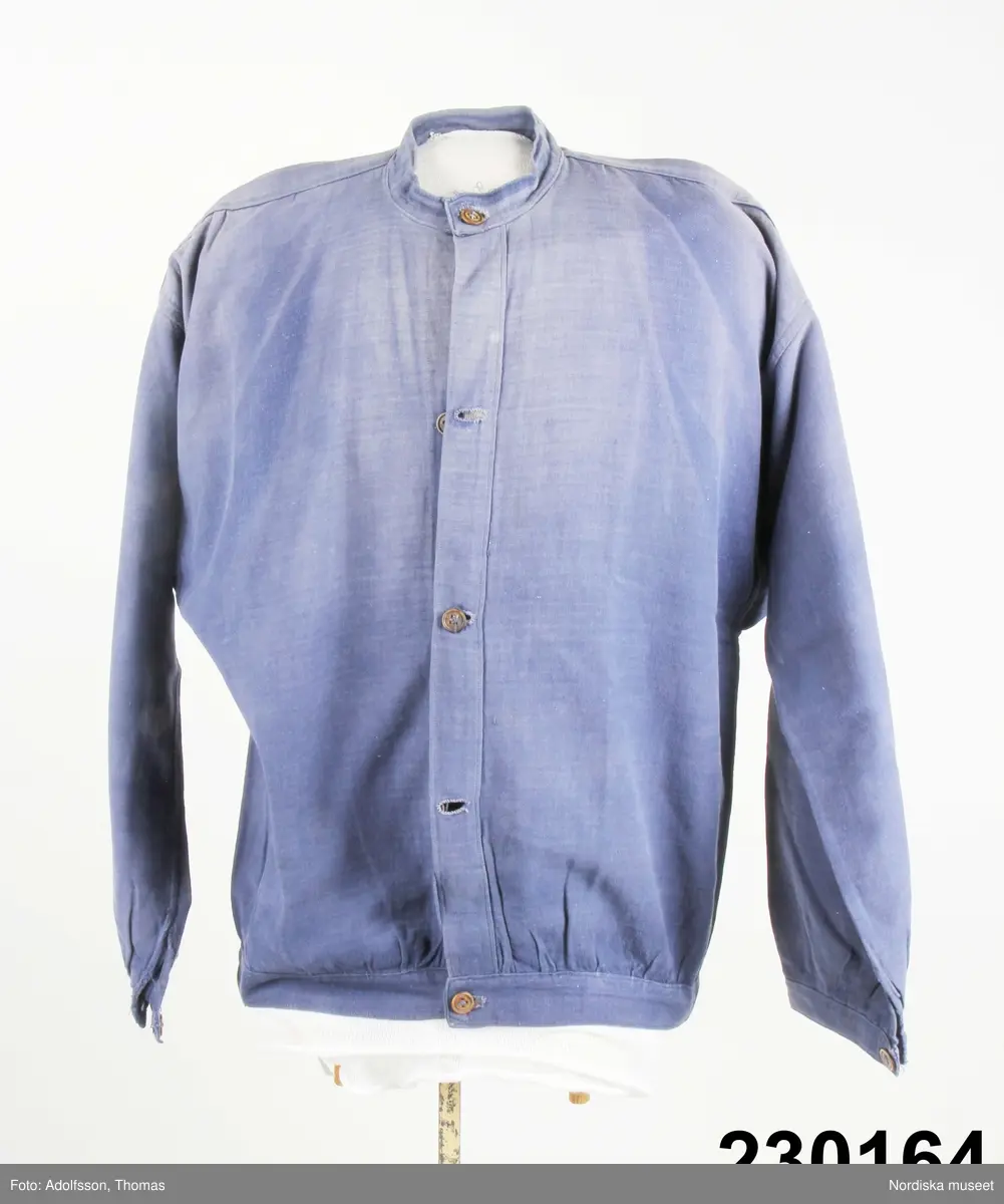 Arbetsskjorta - blus, s.k. bussarong av mörkblå bomullskypert s.k. twills. 2 framstycken, ett ryggstycke, axelok av dubbelt tyg, sydd med fällsömmar. Nedtill lätt rynkad mot en 3,5 cm bred linning, helknäppt fram med 5 bruna knappar, i halsen 2,5 cm bred linning,Vidsydd ärm veckad mot handledslinning med sprund knäppt med en knapp och knapphål. Bussarongen maskinsydd med handsydda knapphål. Anm. Mjuk och något sliten av många tvättar, blekt framförallt på rygg och axlar. Typisk för de tidigaste blåkläderna som kom i början av 1900-talet och då syddes i samma modell som äldre hemvävda bussaronger. Se även 230 165. /Berit Eldvik 2012-12-21