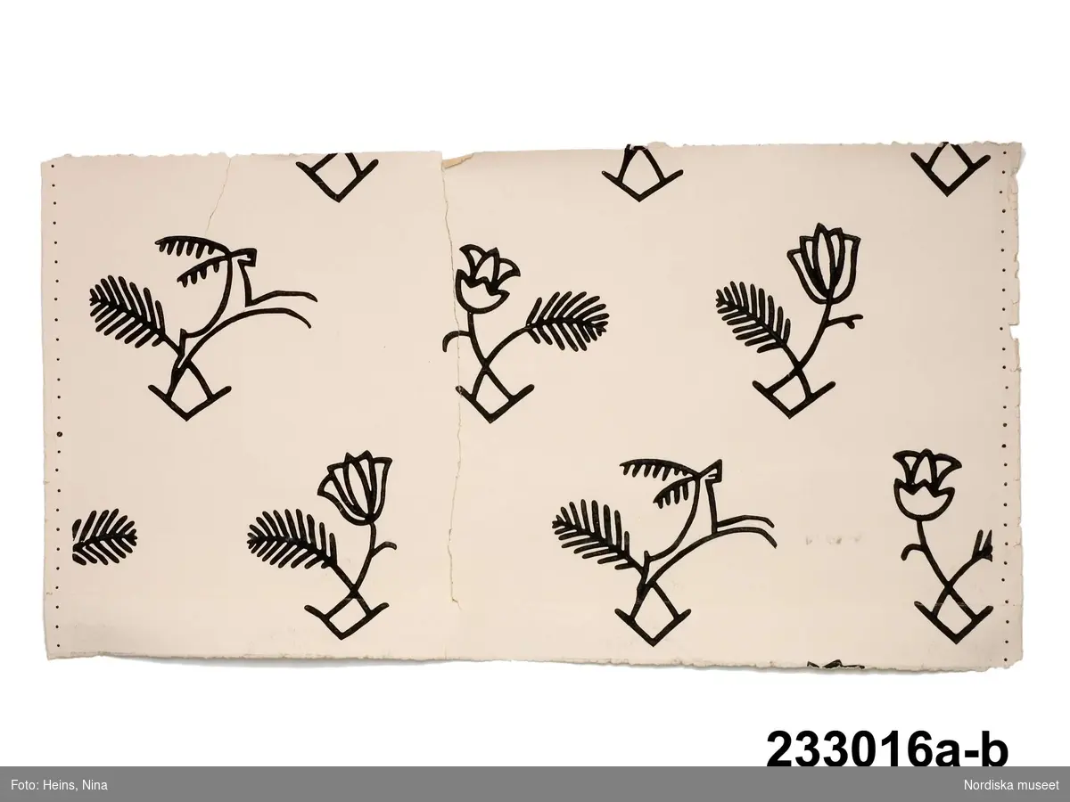 "a-b Tapetprov, 1 fragment + del av rulle, av papper, tryckt med svart på svagt rosafärgad grund. Motiv: stiliserade, konturerade blommor och blad (ormbunkstyp). Komp. av Einar Forseth. Tapeten från Kåberg, nr 25757. 1917."
