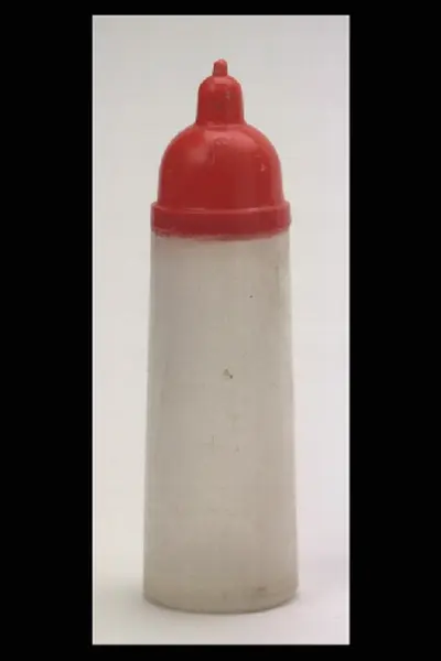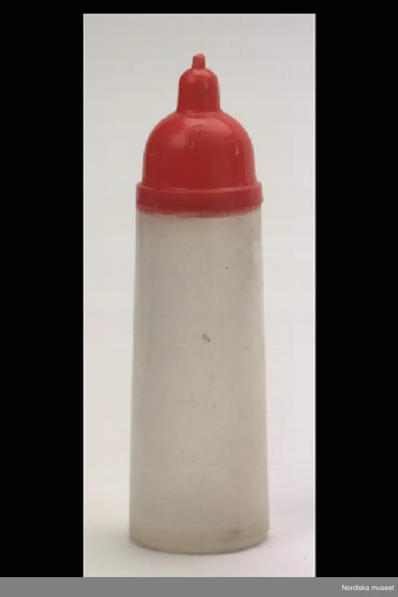 Inventering Sesam 1996-1999: H 13 c, Diam 3,8 cm Nappflaska till docka, av hårdplast, flaskan av transparet plast, överdelen av röd plast. Flaskan har dubbla väggar och därimellan har den varit fylld med vit vätska. När den vändes så rann vätskan ner i överdelen och det såg ut som flaskan blev tom. När den ställdes upp igen så rann vätskan ner i flaskdelen igen. Plasten är mycket krackelerad. Mä...