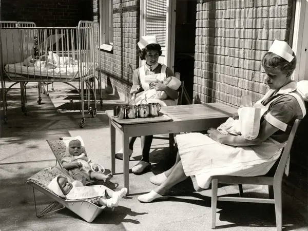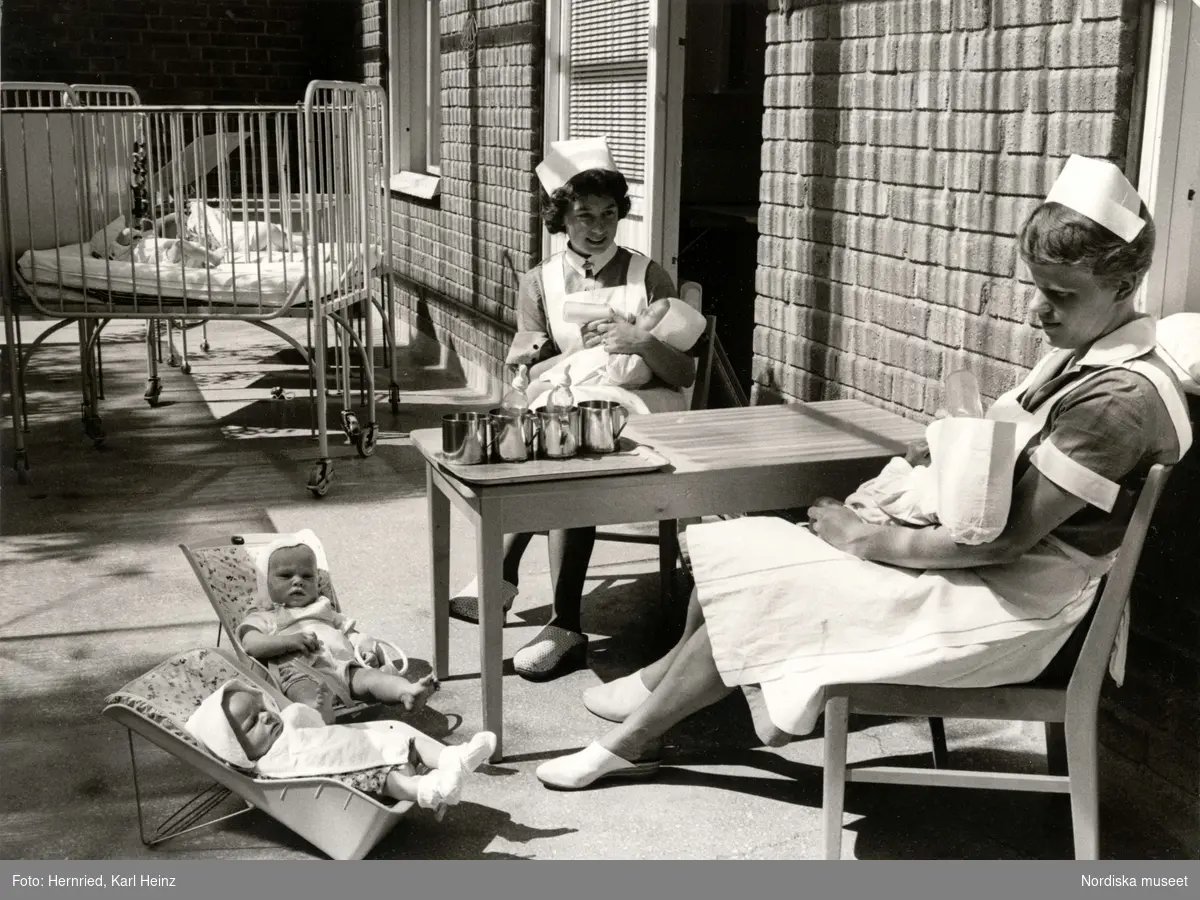 • Barnsköterskor matar spädbarn med nappflaskor, ute på altan. Barnsköterskan i bakgrunden Zanny Sundström. (Källa Gunnar Sundström, via digitalt museum.se)