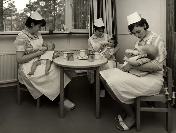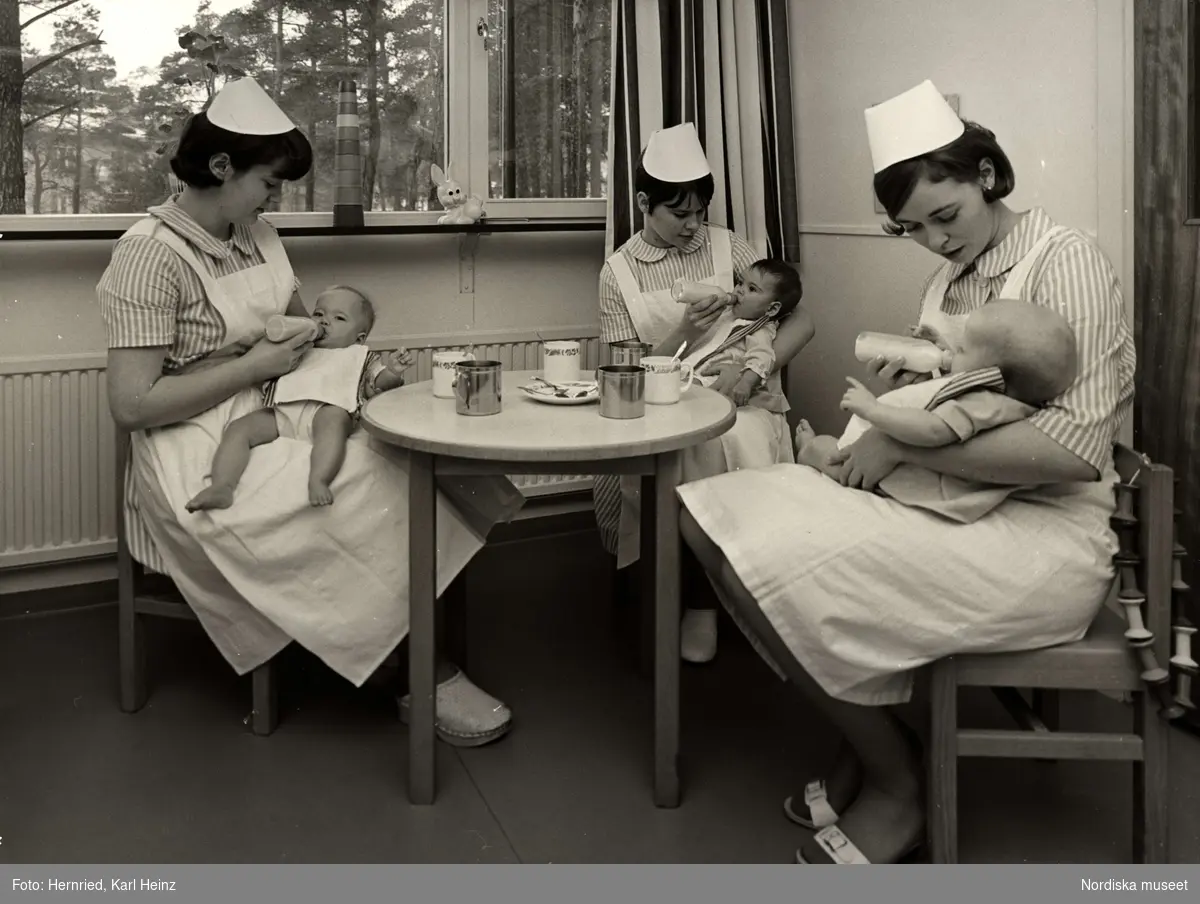 • Spädbarnshem. Några sköterskor sitter med barn i knät och matar med nappflaska