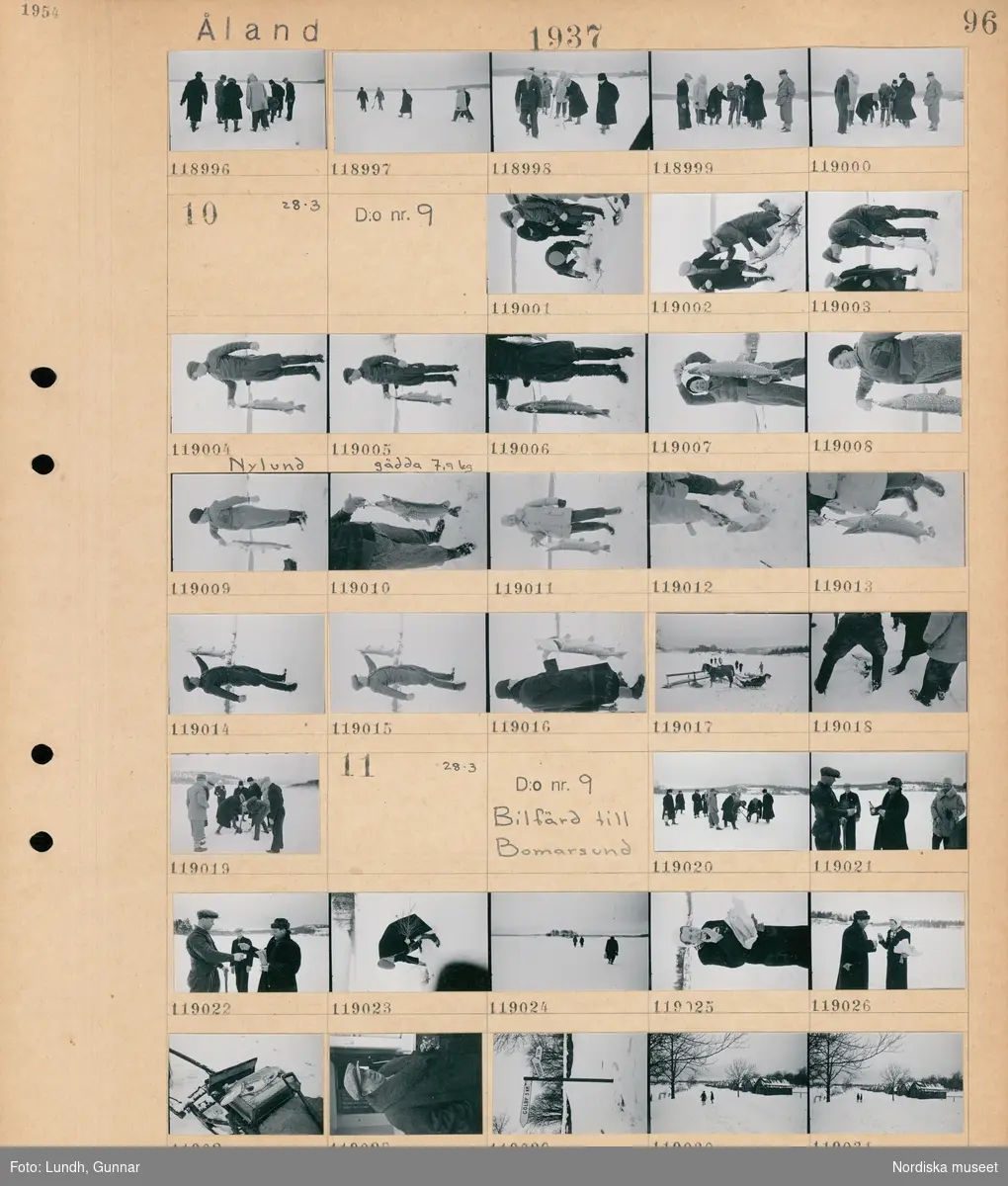 Motiv: Åland, Mariehamn, Fisketuren; En grupp män som isfiskar. Motiv: Åland, Mariehamn, Fisketuren; En grupp män som isfiskar, en man Nylund håller upp en gädda på 7,9 kg. Motiv: Åland, Mariehamn, Fisketuren, Bilfärd till Bomarsund; En grupp män som isfiskar, en kvinna som äter en smörgås utomhus, en gädda som ligger på en låda, porträtt av en man, en vägskylt "Gölby 5 km", en snötäckt landskap...