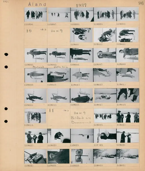 Motiv: Åland, Mariehamn, Fisketuren; En grupp män som isfiskar. Motiv: Åland, Mariehamn, Fisketuren; En grupp män som isfiskar, en man Nylund håller upp en gädda på 7,9 kg. Motiv: Åland, Mariehamn, Fisketuren, Bilfärd till Bomarsund; En grupp män som isfiskar, en kvinna som äter en smörgås utomhus, en gädda som ligger på en låda, porträtt av en man, en vägskylt "Gölby 5 km", en snötäckt landskapsvy med fotgängare och hus.