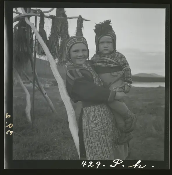 • En flicka bär ett litet barn i famnen. De står intill en torkställning där det hänger flätor av gräs/ hö.