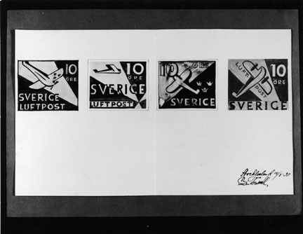 Ej realiserade förslag till frimärke Nattpostflyg, utgivet 9/5 1930. Konstnär: Einar Forseth. Foton 31/5 1967. Kartong med fyra förslag. Sign. och daterad "14/2 1930". Valör 10 öre.