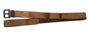 • Gehäng i form av brun läderrem med raka kanter och framtill tillskuren spets. 21 slagna hål. Spänne av gråaktigt stål, rektangulär ram med rulle.