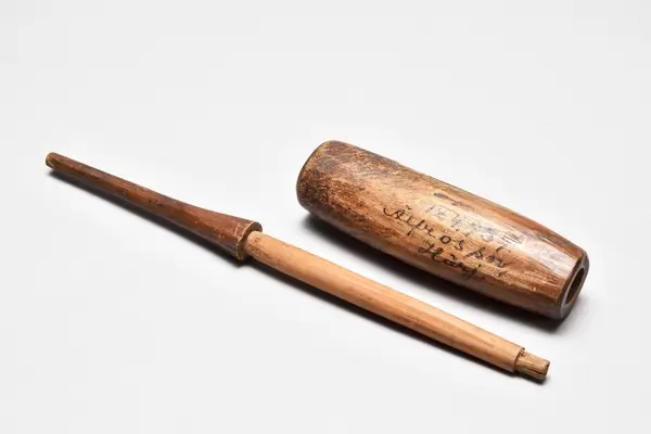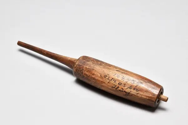 • Rullsticka av trä, omålad, bestående av två lösa delar; en pinne samt en svarvad hylsa som går att trä över pinnen. Används vid spinning av garn.