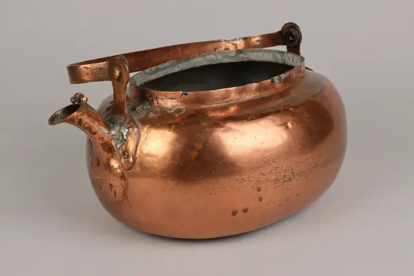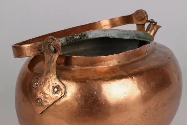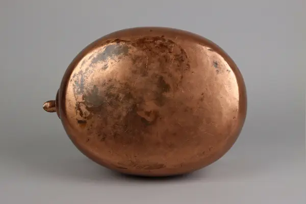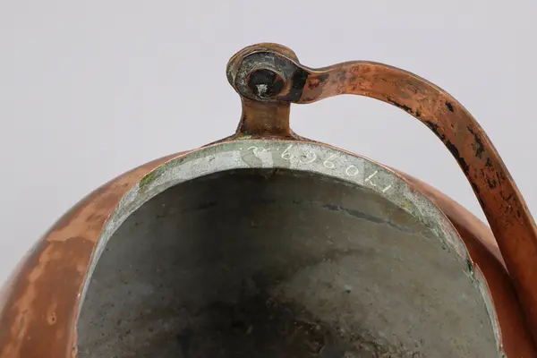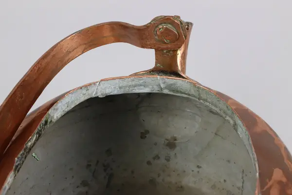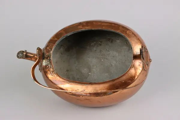 • Kaffepanna driven ur ett stycke med en lödfog för fäste av pipen. Oval form, svängd pip med fäste för fällbart lock. Själva locket till pipen saknas. Fällbart bygelhandtag med mustasch- och hjärtforma... Visa hela