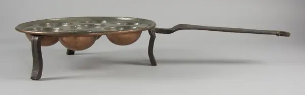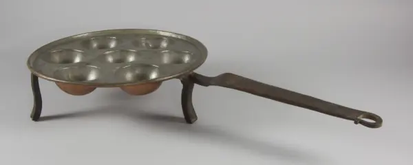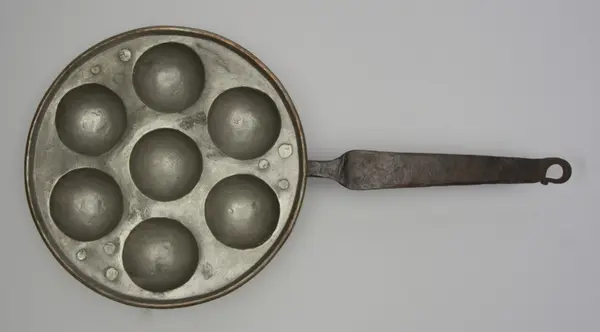 Munkpanna av koppar, med sju djupa runda stekytor för gräddning av munkar. Med skaft och tre ben av järn, nitade mot pannans undersida. Benen svagt svängda. Skaftet med smidd ögla för upphängning. Insidan med förtenning.