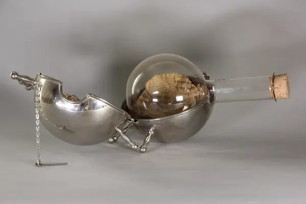 Kaffepumpa med hölje. Kaffepumpa av klart glas, klotformad med lång hals. Halsen tillsluten med kork. Klotformat hölje av vitmetall i form av två halvor som är sammanfogade med gångjärn och sprint och kedja. På varje halva handtag och två ben. Invändigt klädd med isolerfilt och tidningspapper.