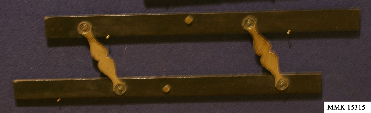 Två lika långa rektangulära svarta träskivor som är fästade vid varandra med på ovansidan två svängda, ornamentlika, platta metallbitar rörliga i fästet till träski...