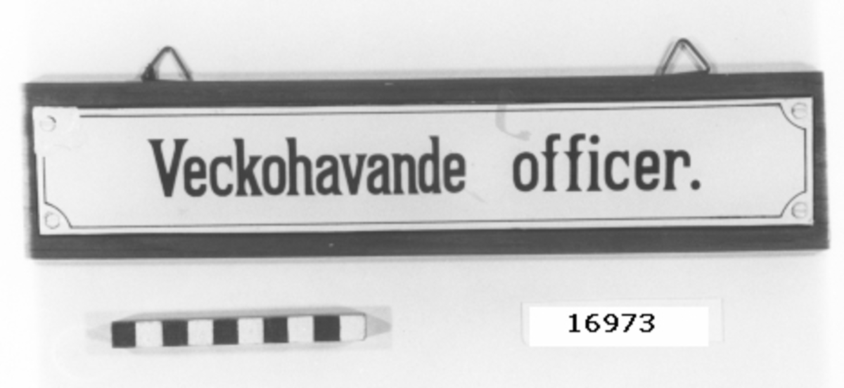 • Rektangulär emaljskylt fastskruvad på träplatta. Vit botten, svart rand längs kanten samt text= "Veckohavande officer". Två öglor för upphängning. Träplatta, fernissad, bredd framsida= 10 mm.