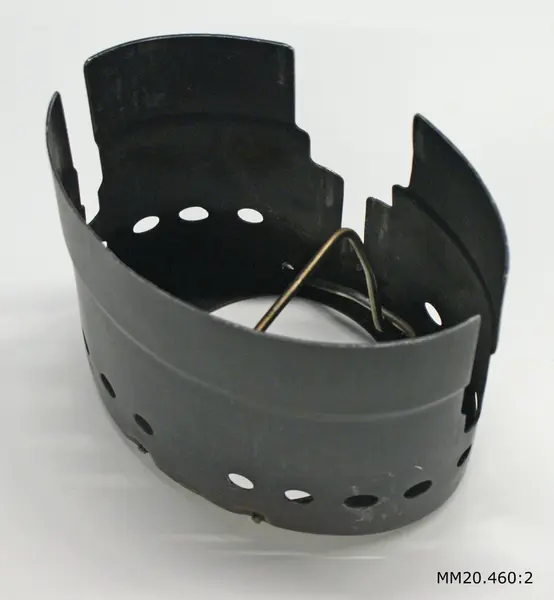 Vindskydd till kokkärl m/40 av grönmålad järnplåt. Avlångt hål i botten. Invändigt två byglar som fälles upp och kokkärlet placeras på. Tillhör enmanskök till kokkärl m/40, bestående av spritbrännare och vindskydd.