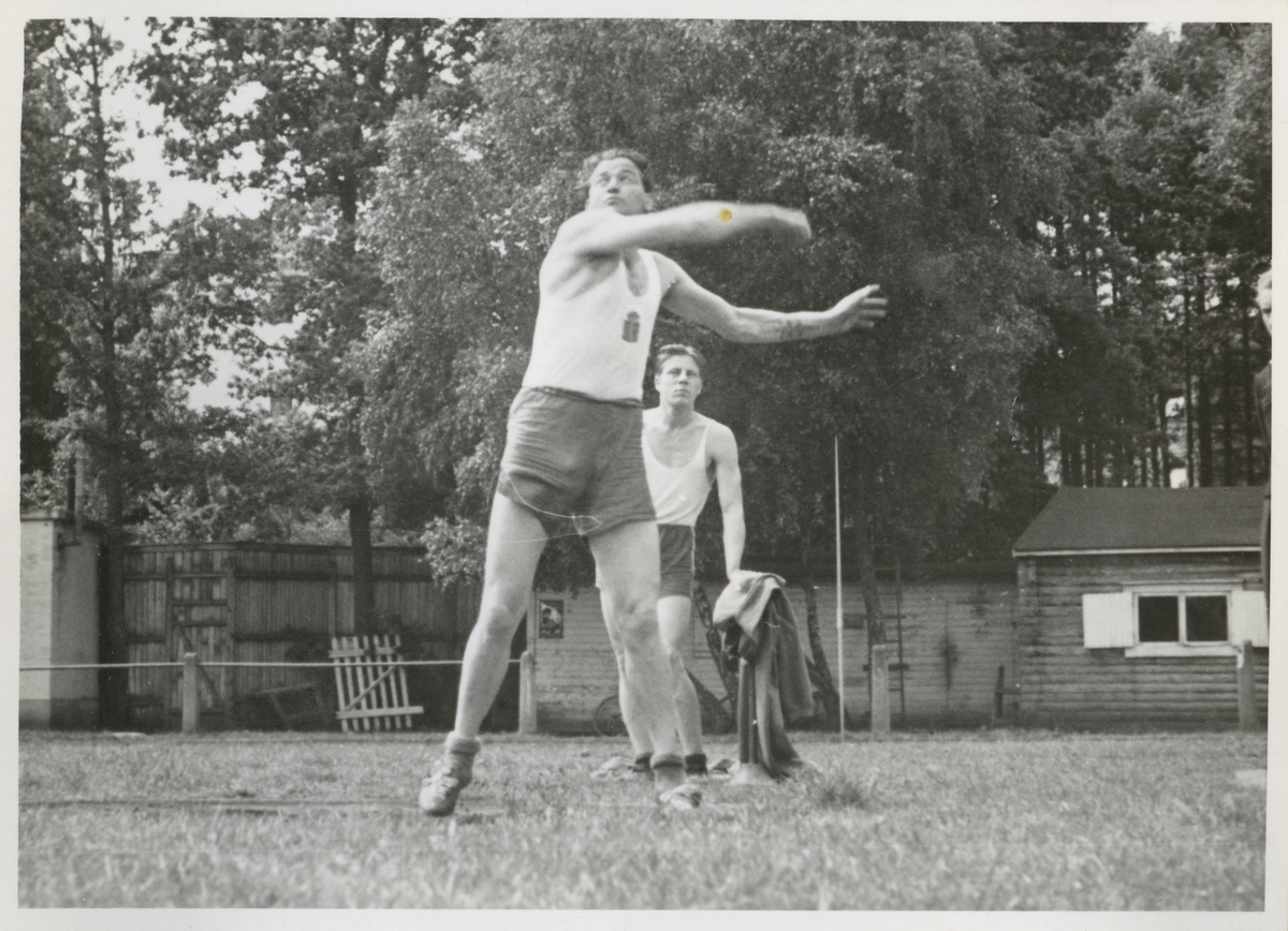 • Två idrottsmän tävlar mot varandra på en gräsmatta. Den ena har precis kastat iväg vad som troligen är en diskus. Båda är klädda i linne och shorts.