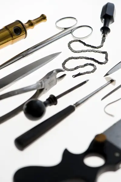 1 lancett, 1 bistourie, 1 artärhake, 1 morfinspruta i fodral