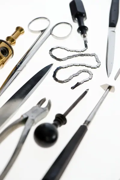 1 bråckkniv, 2 katetrar, 2 pincetter, 1 spruta, av glas